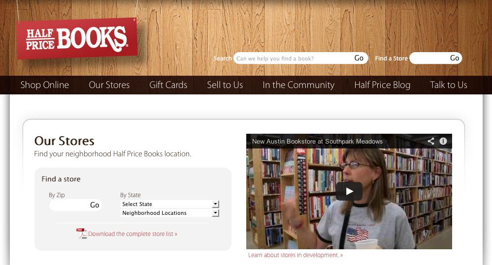 First, video is a great way to launch a new product or in this case… a new store location. Half Price Books posted this video in July about its new Austin, TX location and it has over 1,100 views. Now, in an age when everyone is looking for the next million-view viral video, that might not seem like much. However, I challenge you to think about it from a more realistic perspective.
